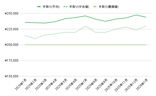 「生活費シミュレーション計算ツール」の利用状況を集計したところ、手取り月収の平均は約24.4万円、中央値は23万円でした。また、最頻値は20万円でした。