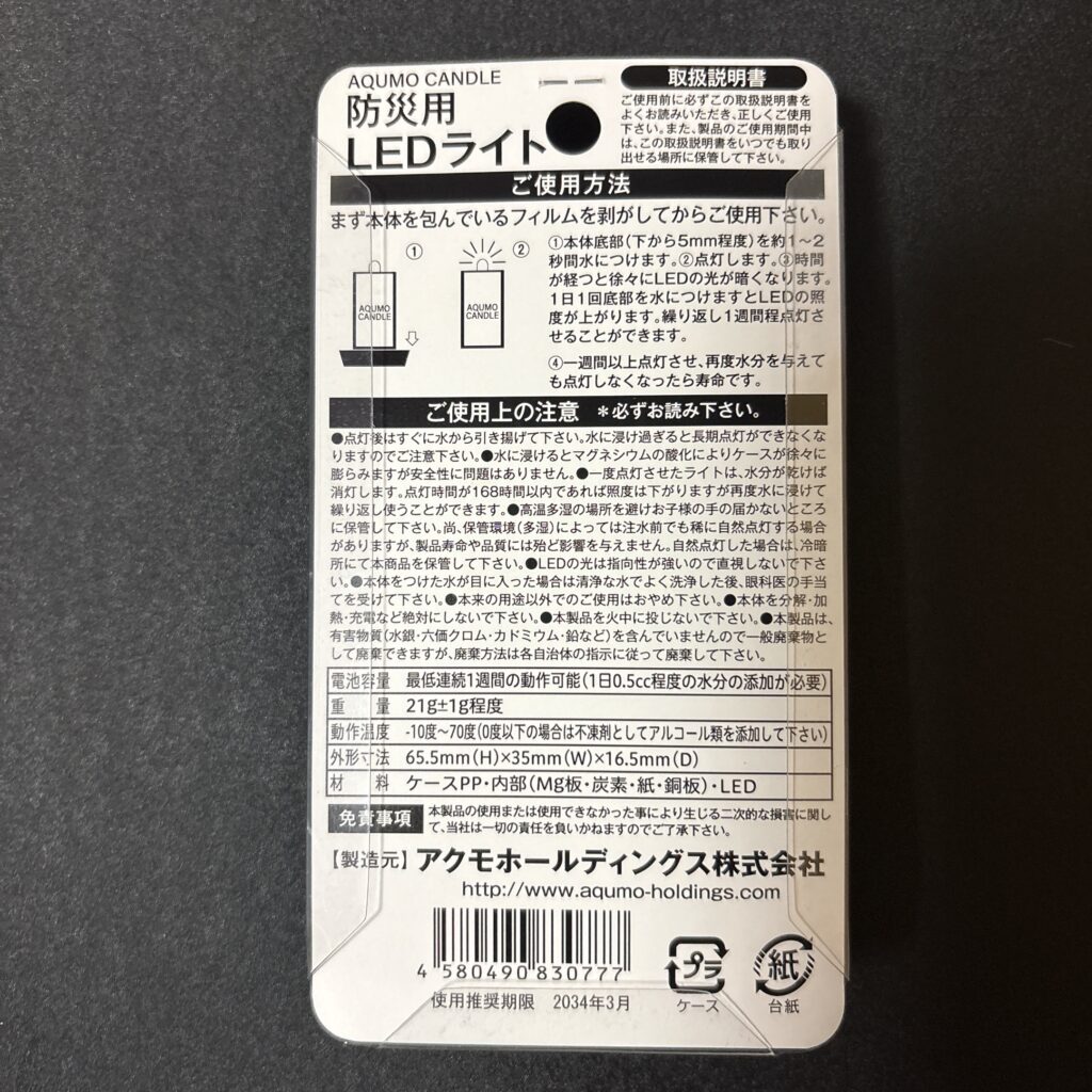 「アクモキャンドル」は、火や乾電池を一切使わず、少量の水分だけで点灯する独自の仕組みを採用した防災用LEDライトです。