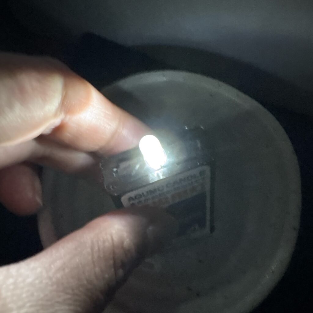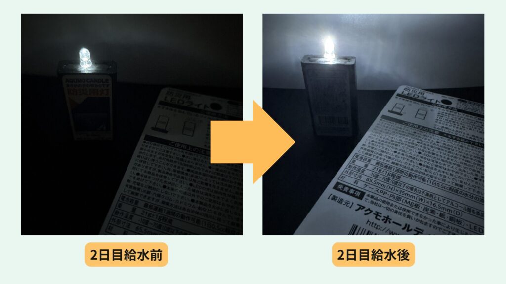 給水すると、初回ほどではありませんが光量が強まりました|筆者撮影 ということで、再度2秒ほど水に浸すと、初回ほどではありませんがふわっと明るさが復活。