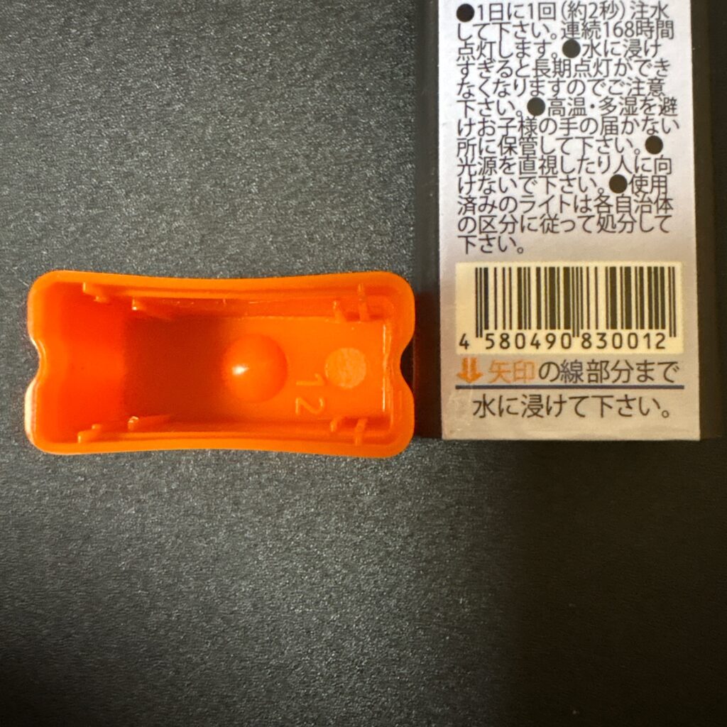 しかし、暗い場所だと少し手間取るかもしれません。今回は、付属キャップにペットボトルの水を注ぎ、そこに本体下部を差し込んで点灯を試みました。