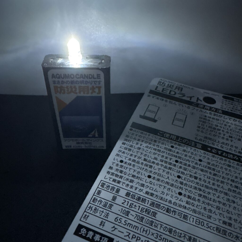 そのため実際に試すことはありませんでしたが、身近な水分である唾液で点灯できるという仕様は、極限状態では大きな安心材料になると感じます。