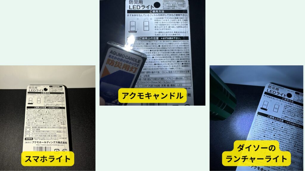 真っ暗な部屋で、アクモキャンドル・スマホライト・小型LED懐中電灯の明るさを比較|筆者撮影 アクモキャンドルは、スマートフォンのフラッシュライトよりも光が柔らかく、眩しさが抑えられています。