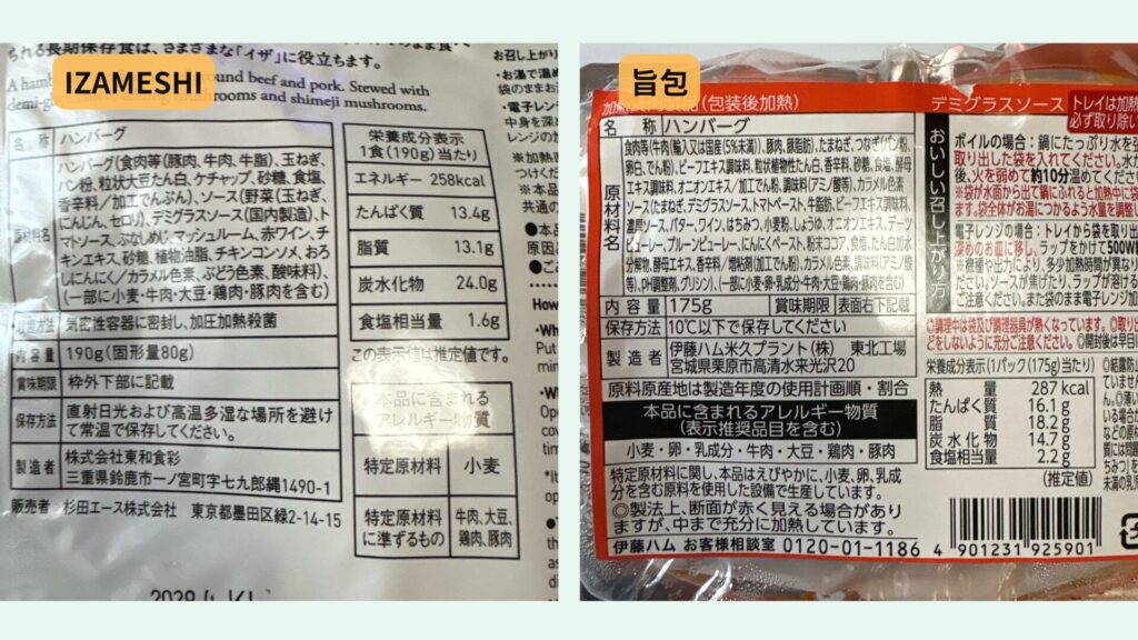IZAMESHIと旨包の原材料、栄養成分等比較|筆者撮影