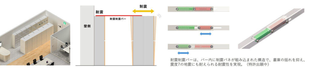 バー内に制震バネを組み込んだ構造により、書庫の揺れを抑え、震度7相当の地震にも耐えることができる耐震性を備えているため、設置によりオフィスの安全性を高めてくれるということです。