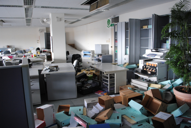 震災時には、オフィス内の備品や書類が大きく散乱し、避難経路の確保や一時的な避難場所としての活用が困難になる場合があるそうです。