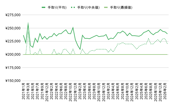 最頻値は2021年1月から一貫して20万円です。
