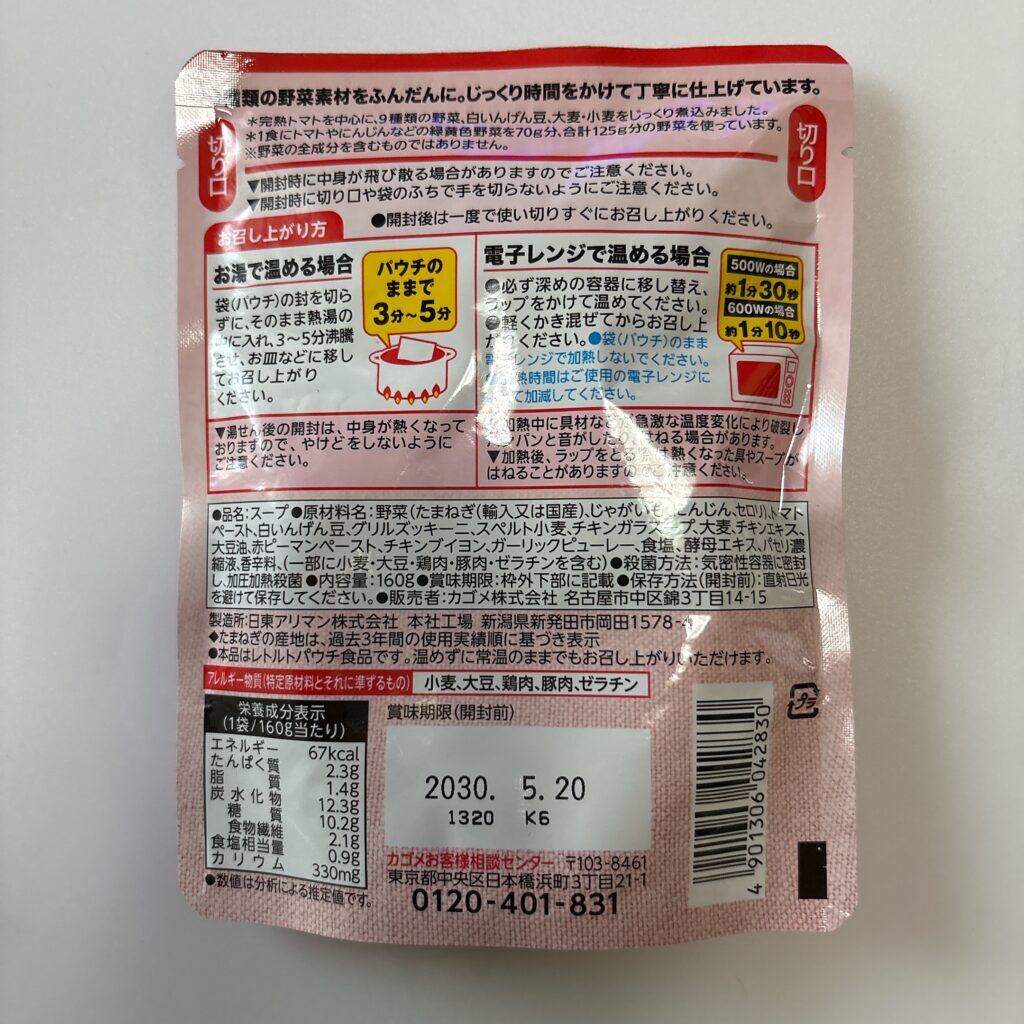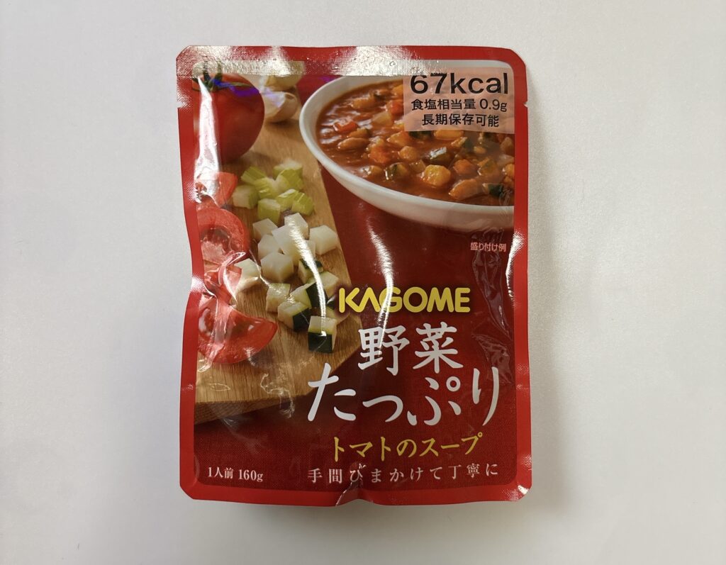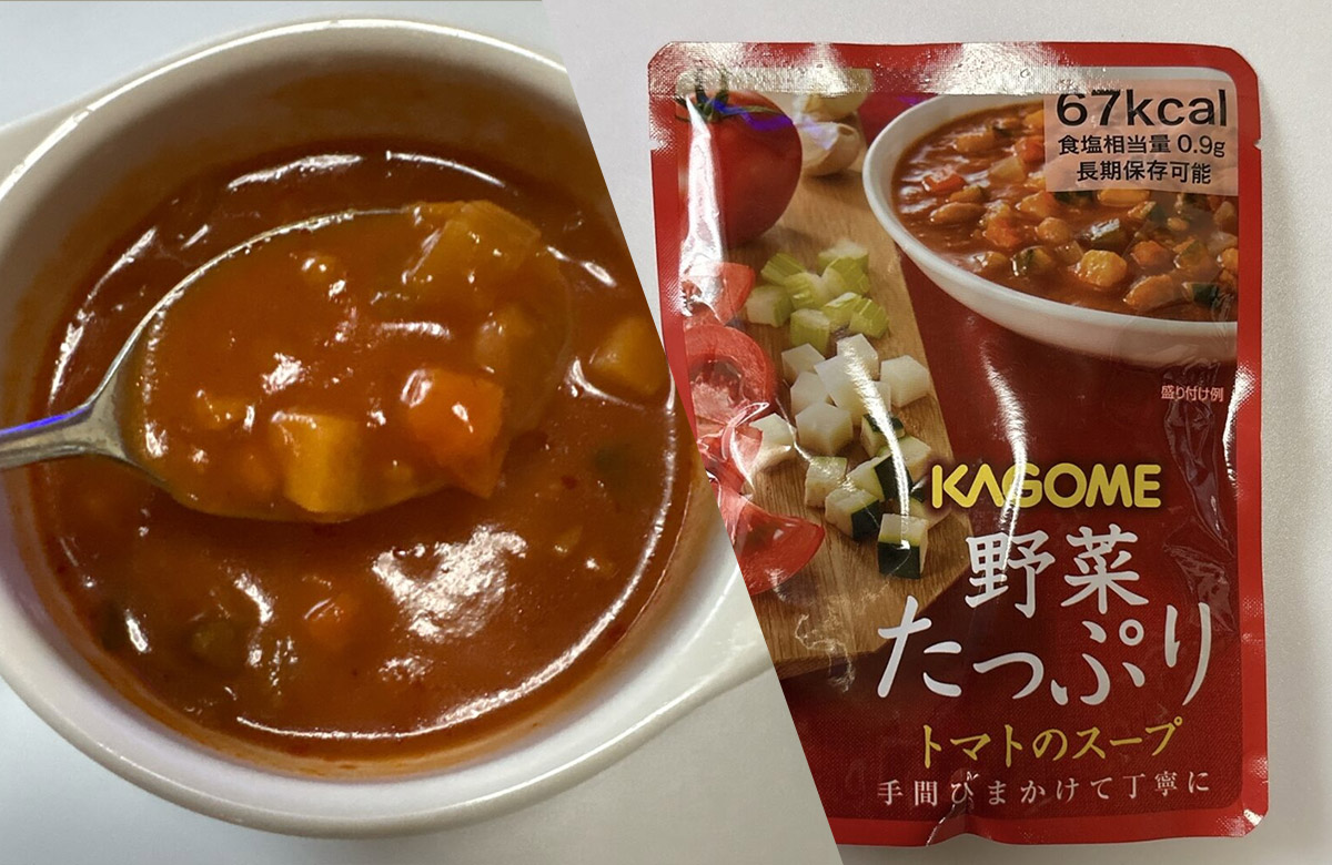 今回は、手軽に野菜を補える“副菜型の備蓄食”として、カゴメの「野菜たっぷりトマトのスープ」を実食。