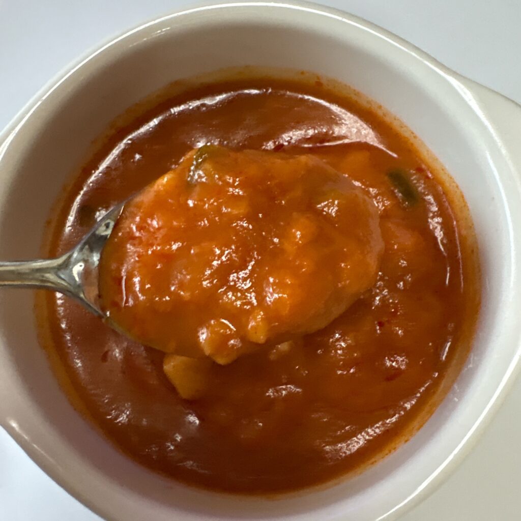 その分、ややこぼれやすいため注意が必要です。常温で食べると、油分がやや分離しているような舌触りがあり、最初は多少気になりましたが、冷製スープだと思えば美味しく食べられました。